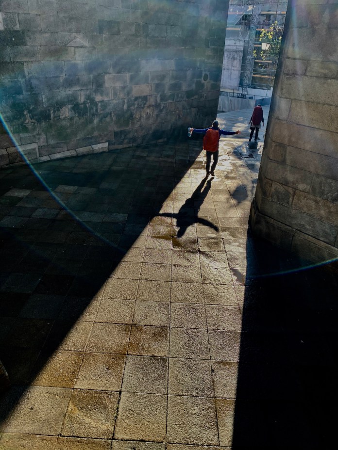 Eis que o arco-íris surge no horizonte para nos saudar e relembrar que estávamos na reta final para alcançar o pote de ouro tão ansiado. A paisagem começou a harmonizar-se quando entrámos no centro histórico. As pernas levitavam e todo o esforço transmutara para um estado de fluidez que era uma estreia, passadas tantas passadas. Silenciámo-nos e demos as mãos ao percorrer a Praza das Praterías, com a sua Fonte de Cavalos de pedra, a segredar-nos que, também, nós estávamos próximas de saciar a sede. Uma sede de luz, presença e paz interior que emana da contígua Praça da Catedral, aonde entrámos de lágrimas nos olhos e sorriso em riste.